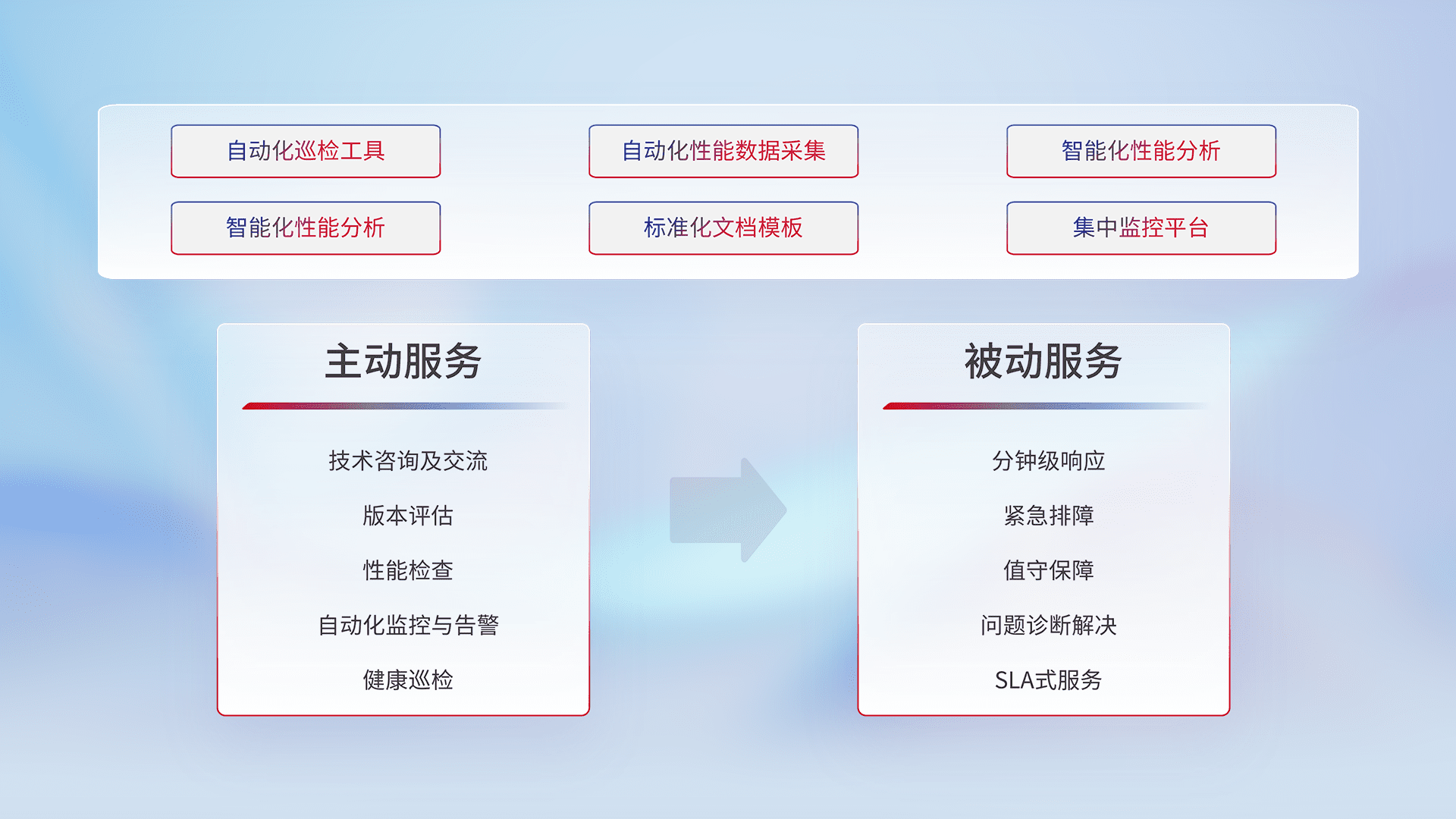 智能化工具和标准化文档,,,保障服务质量,,提供主动服务(包含技术咨询、、、、版本评估、、、性能检查、、、、自动化监控与告警、、、健康巡检)和被动服务包含(分钟级响应、、、、紧急排障、、值守保障、、、、问题诊断解决、、、、SLA服务)。。